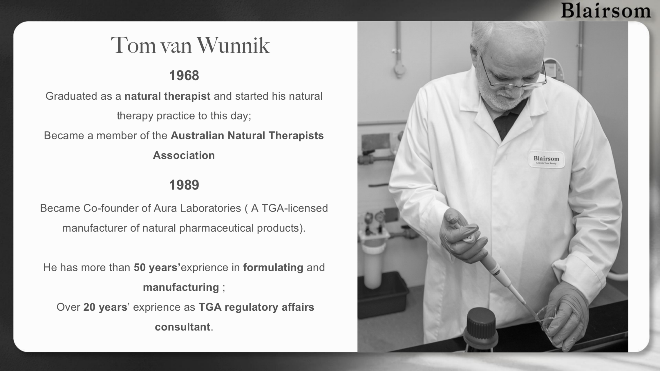 In 1989, he became Co-founder, Director and 50% owner of Aura Laboratories, a TGA-licensed manufacturer of natural pharmaceutical products. The business was sold in 1998. Tom has been a TGA regulatory affairs consultant for 20 years, assisting clients through the registration process for their products.